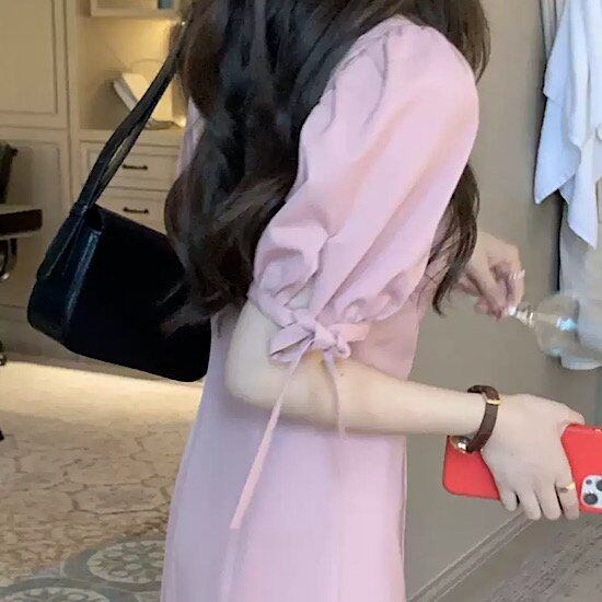結婚式ドレス パフスリーブ 袖リボン スクエアネック 無地 シンプル ミモレ丈 発表会 演奏会 レディース 結婚式 ステージ衣装 エレガント ウエディングドレス カラードレス スリット