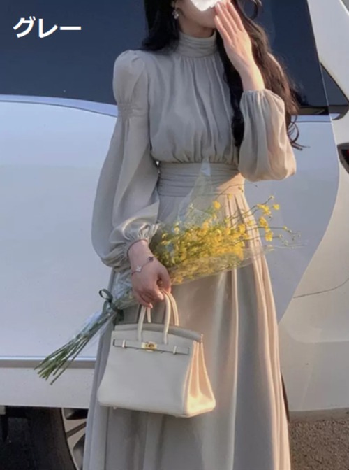 シフォンワンピース レディース ワンピース ロングワンピース 長袖ワンピース ハイウエスト スタンドカラー ランタンスリーブ ボリューム袖 カジュアル きれいめ フェミニン お出かけ 無地 おしゃれ