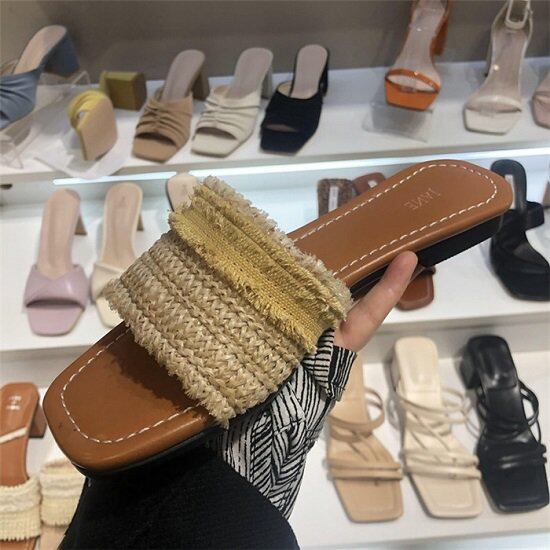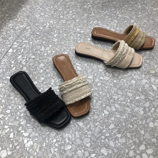 サンダル ミュール フリンジ ローヒール ぺたんこ フラットサンダル 歩きやすい フリンジベルト ぺたんこミュール ラタン 夏 レディース メッシュ スクエアトゥ サンダル ミュール フリンジ