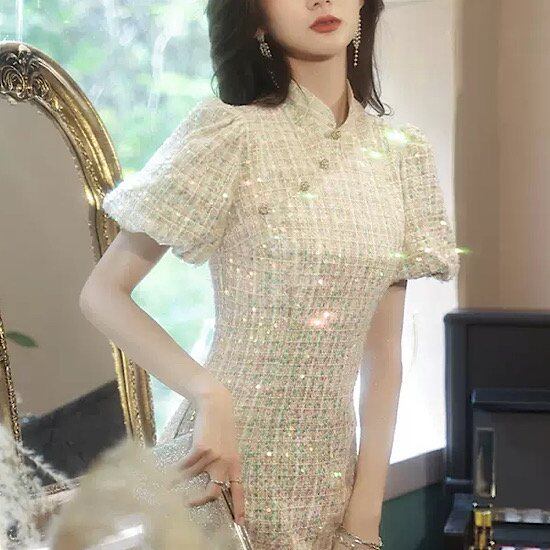 結婚式ドレス チャイナ風 マーメイド ツイード ミモレ丈 ハイウエスト 発表会 演奏会 レディース 結婚式 ステージ衣装 エレガント ウエディングドレス カラードレス イブニングドレス