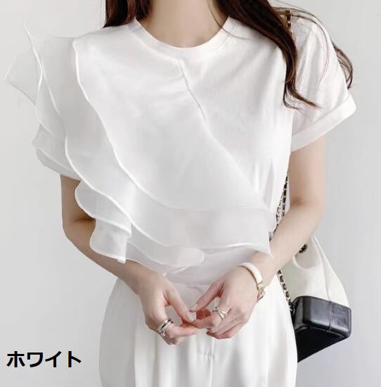 半袖Tシャツ レディース Tシャツ トップス カットソー 半袖 フリル ラウンドネック カジュアル お出かけ おしゃれ アシンメトリー ボリューム 黒 白 ブラック ホワイト 春夏 女性 フリル