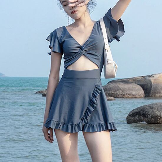 ワンピース水着 レディース 水着 スイムウェア ビーチウェア ショートパンツ付き 2点セット フリル スカート ツイストデザイン Vネック 無地 カジュアル 海 ビーチ プール 海水浴 リゾート 夏