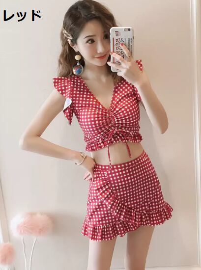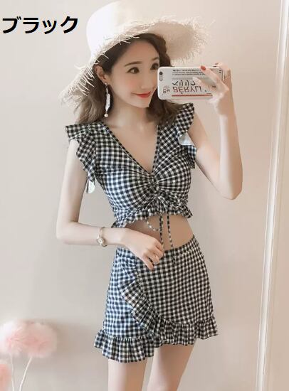 ビキニ レディース 水着 ツーピース セット チェック柄 Vネック フリル タンキニ カジュアル 可愛い 海 ビーチ プール 海水浴 リゾート 夏 スイムウェア ビーチウェア ギンガムチェック 女性