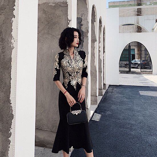 結婚式ドレス 五分袖 マーメイド スリム 刺繍 ミモレ丈 ハイウエスト 発表会 演奏会 レディース 結婚式 ステージ衣装 エレガント ウエディングドレス カラードレス イブニングドレス