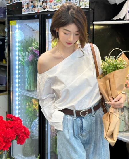 長袖シャツ レディース シャツ ブラウス トップス ワンショルダー アシンメトリー 白 ホワイト 長袖 カジュアル お出かけ おしゃれ シンプル 無地 春夏 ルーズ 長袖ブラウス トップス 肩見せ