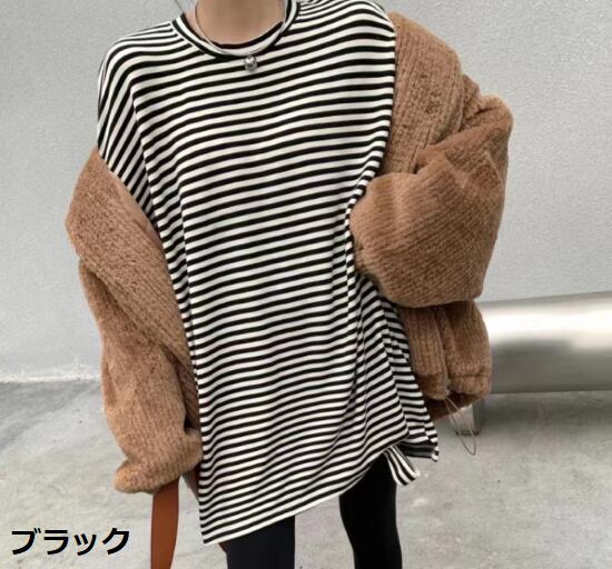 長袖Tシャツ レディース トップス ロンT ボーダー ラウンドネック ゆったり ルーズシルエット 穴あきデザイン 袖タグ カジュアル お出かけ おしゃれ プルオーバー カットソー 長袖トップス 女性