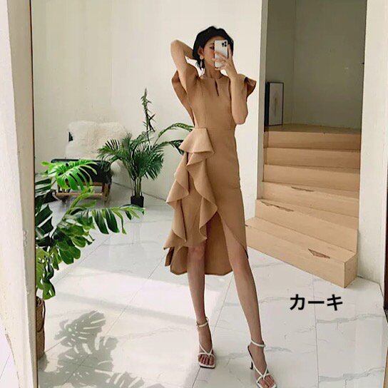結婚式ドレス 立体フリル フレンチ スリム 無地 シンプル ミモレ丈 ハイウエスト 発表会 演奏会 レディース 結婚式 ステージ衣装 エレガント ウエディングドレス カラードレス イブニングドレス