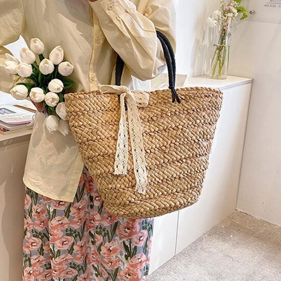 トートバッグ レディース ハンドバッグ 鞄 かばん かごバッグ カゴバッグ バスケット レース リボン りぼん ストローバッグ 大容量 シンプル 無地 バカンス カジュアル お出かけ おしゃれ 夏