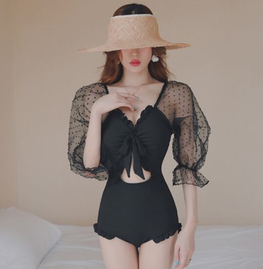 ワンピース水着 レディース 水着 フリル リボン 黒 ブラック シースルー レース ドット柄 水玉 フェミニン 可愛い おしゃれ カットアウトデザイン スイムウェア ビーチウェア 夏 海 リゾート