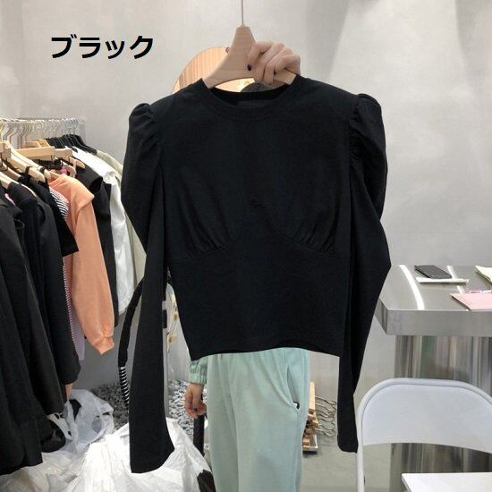 ロンT パフスリーブ ショート丈 長袖 ラウンドネック 春 丸首 フェミニン 無地 シャツ パワーショルダー トップス 着痩せ パワショル レディース Tシャツ ロンT パフスリーブ ショート丈