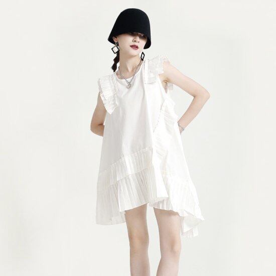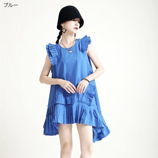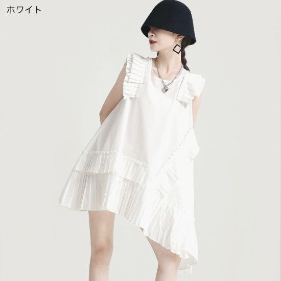 ブラウス アシンメトリー プリーツ デザイン 夏 無地 キレイめ フリル おしゃれ ゴージャス フレンチ サマー ミドル丈トップス タンクトップ モード レディース ノースリーブ ラウンドネック