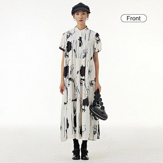シャツワンピース ロング丈 ヘンリーネック スタンドカラー シャツワンピ ロングワンピ 柄 柄ワンピ フレア Aライン ティアード 半袖 ゆったり シャツワンピース ロング丈 ヘンリーネック