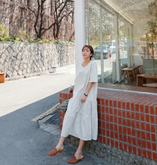 半袖ワンピース レディース ワンピース ロングワンピース ラウンドネック ロング丈 リネンワンピース シンプル 無地 Aライン ティアードワンピース フェミニン ゆったり カジュアル お出かけ 女性