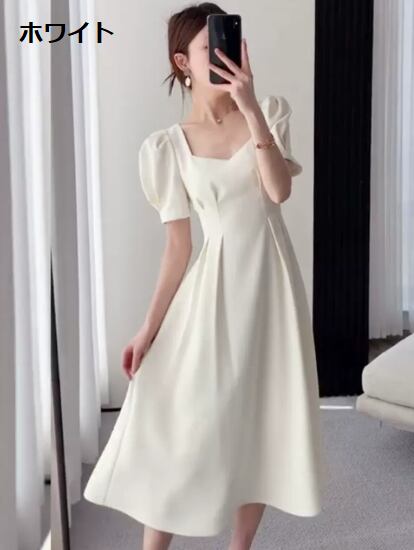 パーティードレス レディース ワンピース 結婚式ドレス 演奏会ドレス 半袖 パフスリーブ ハイウエスト ミドル丈ワンピース Aライン きれいめ お呼ばれ フォーマル パーティー シンプル エレガント