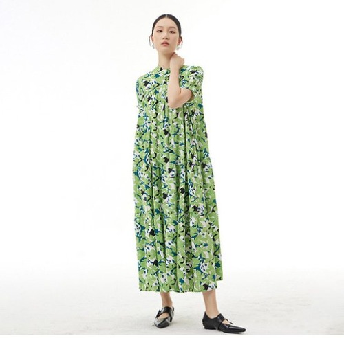 ワンピース 花柄 ロング丈 かわいい おしゃれ ゆったり ワンピース 着痩せ 大きめサイズ シャツワンピース イエロー グリーン 半袖 ふんわり エレガント カジュアル 20代 30代 40代