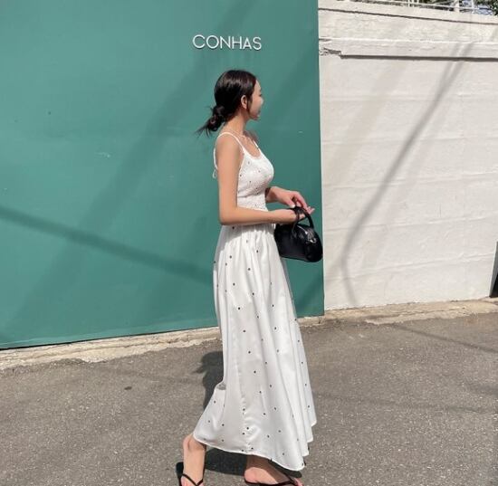 キャミソールワンピース レディース ワンピース ロングワンピース シャーリング 切り替え 水玉 ドット柄 ハイウエスト バックリボン バックシャン カジュアル お出かけ おしゃれ リゾート バカンス