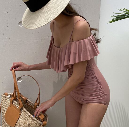 ワンピース水着 レディース 水着 ビーチウェア スイムウェア フリル オフショルダー カジュアル おしゃれ 可愛い シンプル 無地 体型カバー バックシャン 海 ビーチ プール 海水浴 夏 女性
