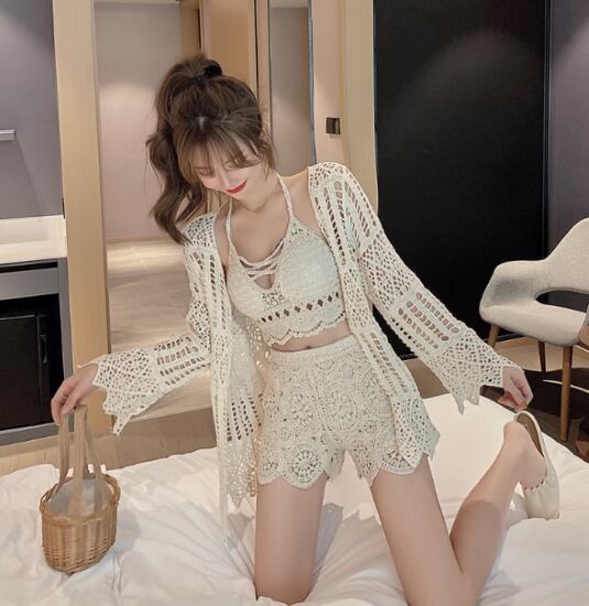 ビキニ レディース 水着 3点セット カバーアップ付き 長袖 セパレート ショートパンツ クロシェ編み ホルターネック ハイウエスト 体型カバー スリーピース スイムウェア ビーチウェア 海 夏