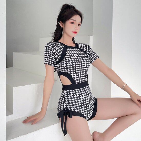 ワンピース水着 千鳥格子 リボン付き 水着 オールインワン ワンピース レディース 半袖 背中開き 体型カバー 露出控えめ スイムウェア スリット ビーチ ワンピース水着 千鳥格子 リボン付き