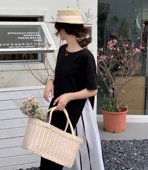半袖ワンピース レディース ワンピース ミドル丈 切り替えデザイン バイカラー サイドリボン シンプル 無地 大きいサイズ ラウンドネック カジュアル お出かけ おしゃれ 夏 ミモレ丈 ワンピース