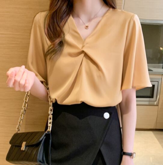 シフォンブラウス レディース ブラウス トップス 半袖ブラウス ツイストデザイン Vネック シンプル 無地 カジュアル お出かけ おしゃれ きれいめ プルオーバー オフィス OL シフォン 女性