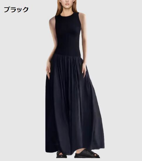 ノースリーブワンピース レディース ワンピース ロングワンピース シンプル 無地 切り替え ラウンドネック カジュアル お出かけ おしゃれ ハイウエスト プルオーバー 女性 夏 ブラック ホワイト