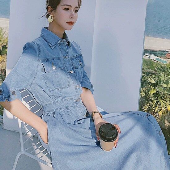 デニムワンピース 袖ロールアップ シャツワンピース ロング丈 ロングワンピ ウエストマーク ワンピース Aライン シャツワンピ 大きいサイズ デニムワンピース 袖ロールアップ シャツワンピース
