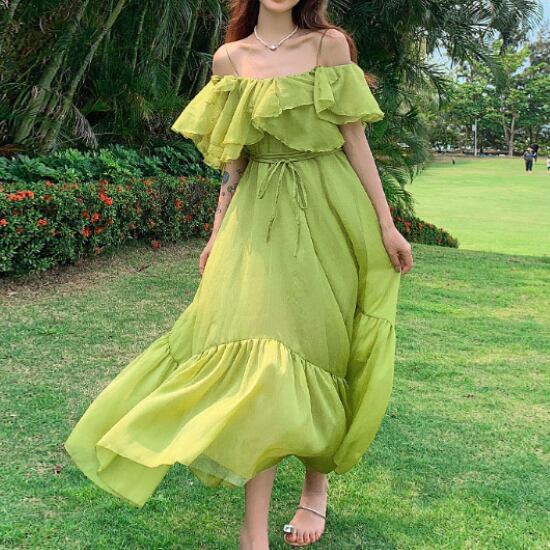 リゾートワンピース レディース ワンピース シフォンワンピース ロングワンピース オフショルダー ウエストリボン フリル ハイウエスト 無地 カジュアル お出かけ おしゃれ きれいめ エレガント 女性