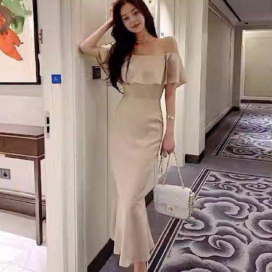 結婚式ドレス オフショルダー フリル マーメイドスカート スリム ミモレ丈 発表会 演奏会 レディース 結婚式 ステージ衣装 エレガント ウエディングドレス カラードレス イブニングドレス