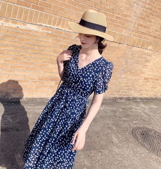 花柄ワンピース レディース ワンピース ミドル丈ワンピース 半袖ワンピース 小花柄 フラワー フローラル Vネック パフスリーブ フェミニン 総柄 ハイウエスト カジュアル お出かけ おしゃれ 女性