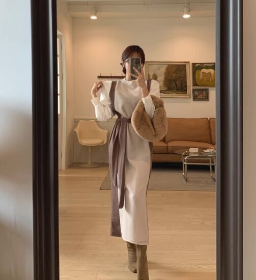 ロングワンピース レディース ワンピース 長袖ワンピース 重ね着風 フェイクレイヤード ラウンドネック ウエストリボン 配色デザイン カジュアル お出かけ おしゃれ きれいめ オフィス ニット 女性