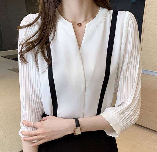 シフォンブラウス レディース ブラウス トップス シフォンシャツ 七分袖 プリーツ モノトーン ラインデザイン Vネック きれいめ エレガント オフィス カジュアル お出かけ おしゃれ シンプル 無地