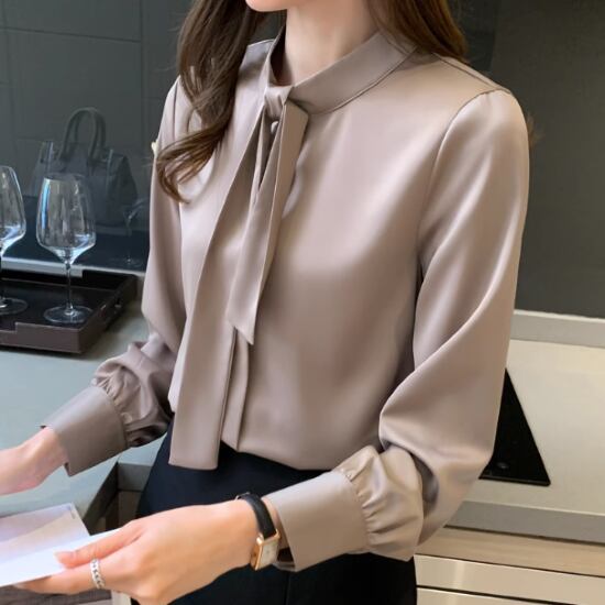 シフォンブラウス レディース ブラウス 長袖ブラウス シフォンシャツ スタンドカラー トップス ボウタイ リボン シルク きれいめ エレガント シンプル 無地 カジュアル お出かけ おしゃれ オフィス