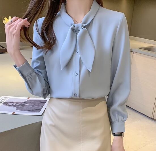 シフォンブラウス レディース ブラウス トップス 長袖ブラウス シフォンシャツ リボンタイ ボタン シンプル 無地 カジュアル お出かけ おしゃれ きれいめ エレガント オフィス ホワイト ブルー