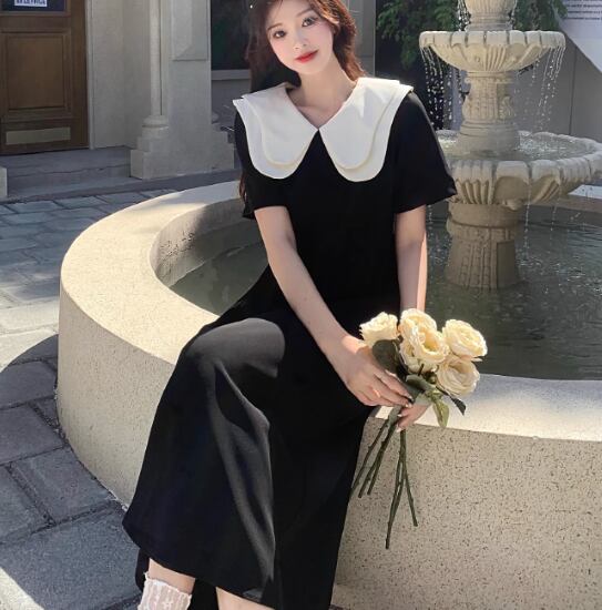 半袖ワンピース レディース ワンピース ミドル丈ワンピース 襟あり ドールカラー バイカラー コントラストカラー ハイウエスト カジュアル お出かけ おしゃれ きれいめ ガーリー お呼ばれ 女性