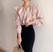 シフォンブラウス レディース ブラウス トップス 長袖シャツ シフォンシャツ フリル ボリューム プルオーバー カジュアル お出かけ おしゃれ きれいめ エレガント 無地 お呼ばれ フォーマル 女性