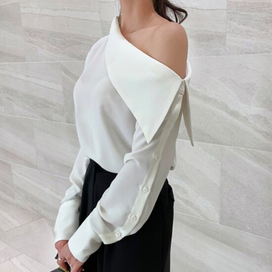 長袖シャツ レディース シャツ トップス カットソー 長袖 ワンショルダー 肩出し 肌見せ セクシー 個性的 シンプル 無地 カジュアル お出かけ おしゃれ きれいめ アシンメトリー 袖ボタン 女性