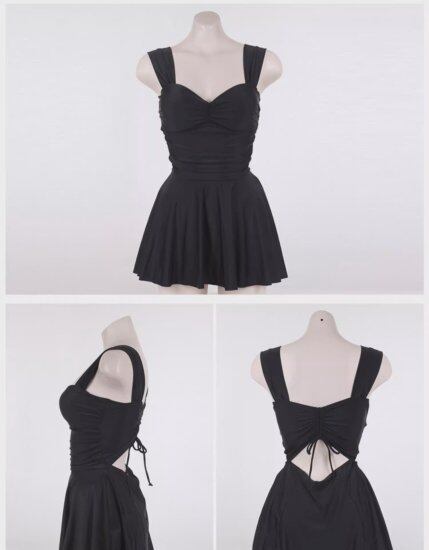 ワンピース水着 レディース 水着 スイムウェア ハートネック ドロスト セパレート 背中見せ 黒 ブラック スカート付き きれいめ 上品 シック 体型カバー プール 海 リゾート バカンス 夏