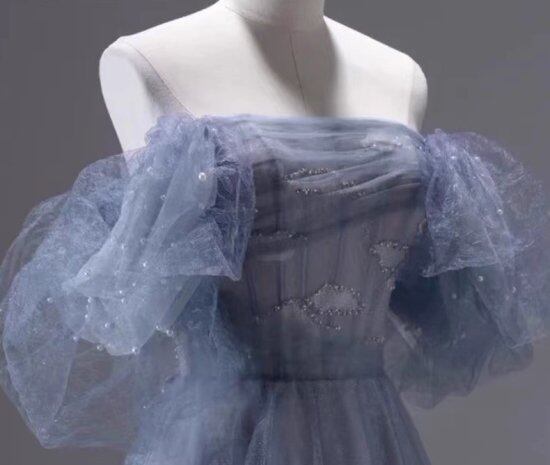 演奏会ドレス レディース 結婚式ドレス オフショルダー ノースリーブ チューブトップ Aライン ボリューム袖 レース 発表会 パーティードレス イブニングドレス エレガント 華やか ブルー 透け感