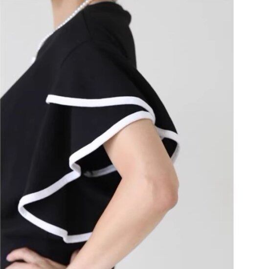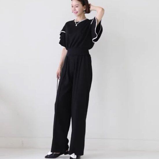 セットアップ レディース パンツスーツ ワイドパンツ ウエストゴム センタープレス フリルスリーブTシャツ ラッフルフリル バイカラー 上下セット おしゃれ きれいめ カジュアル オフィスコーデ