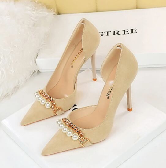 パーティーシューズ レディース パンプス レディース 靴 シューズ ポインテッドトゥ スエード パール チェーン 装飾 おしゃれ ハイヒール ピンヒール きれいめ エレガント 美脚 脚長 お呼ばれ