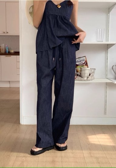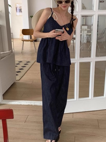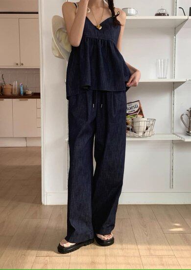 セットアップ レディース デニム ペプラム キャミソール フリル Vネック ワイドパンツ ウエストゴム カジュアルパンツ ゆったり 体型カバー レトロ 上下セット カジュアル リゾート バカンス 夏