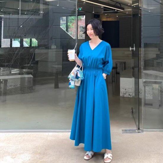 ワンピース レディース Vネック ロングワンピース 半袖 五分袖 パフスリーブ ウエストゴム フレアスカート ハイウエスト 無地 シンプル きれいめ カジュアル オフィス リゾート バカンス