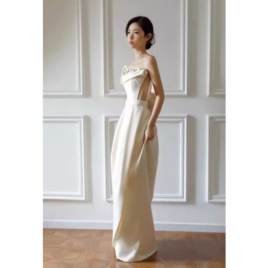 ウェディングドレス 大きいサイズ ビスチェドレス ロングスカート マキシ丈 小柄 Aライン 立体フラワー ベアトップ コクーンスカート スリム 着痩せ サテン 結婚式 二次会 パーティ エレガント
