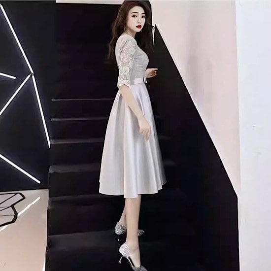 結婚式ドレス ラウンドネック 無地 ミモレ丈 ハイウエスト 発表会 演奏会 レディース 結婚式 ステージ衣装 エレガント カラードレス イブニングドレス 五分袖 フレアスカート 煌めき
