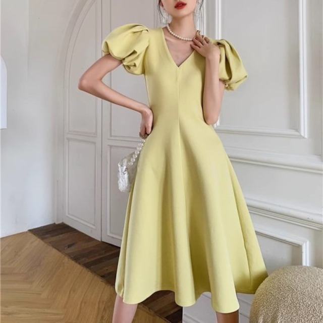 結婚式ドレス レディース Vネック パフスリーブ Aライン ミディアム丈 ひざ丈 半袖 フレア ハイウエスト 二次会 発表会 披露宴 ステージ衣装 パーティードレス エレガント 華やか ワンピース