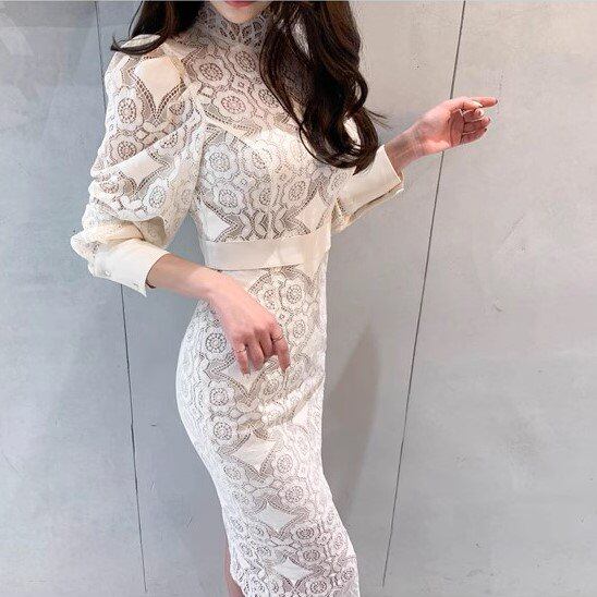 結婚式ドレス レディース レース 長袖 総レース タイトワンピース ハイネック パフスリーブ ハイウエスト 透け感 シアー シースルー 演奏会 披露宴 パーティードレス エレガント 華やか