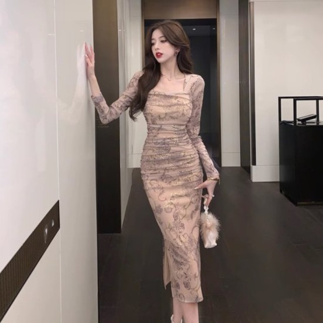 結婚式ドレス レディース プリントワンピース 長袖 スクエアネック ロングドレス ボタニカル スリム タイトワンピース 総柄 プリント ミモレ丈 ロング丈 パーティー エレガント 華やか ワンピース
