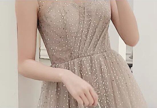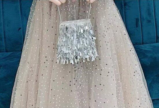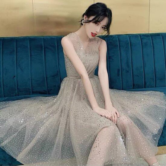 結婚式ドレス レディース Vネック ノースリーブ スパンコール ビジュー Aライン フレアスカート ミモレ丈 ロング丈 演奏会 ステージ衣装 披露宴 パーティードレス イブニングドレス エレガント