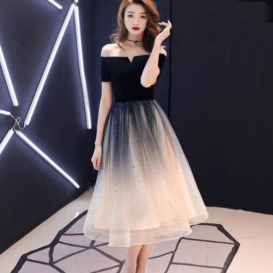 結婚式ドレス レディース オフショルダー グラデーション 透け感 シースルー シアー ミモレ丈 ひざ丈 演奏会 発表会 披露宴 謝恩会 パーティードレス イブニングドレス 華やか エレガント